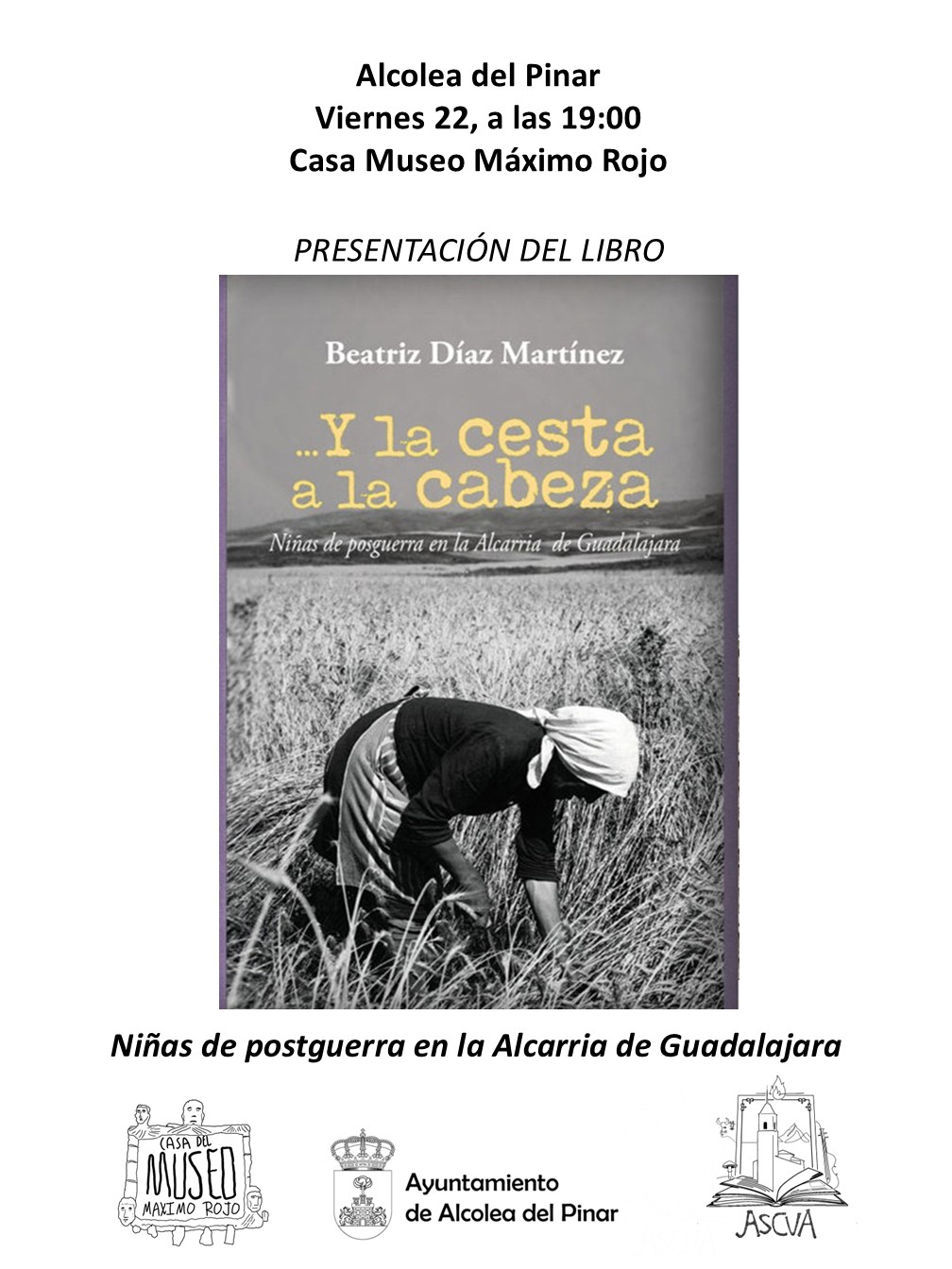 La escritora Beatriz Díaz Martínez, investigadora especializada en memoria oral y bioantropología, presenta con su obra Y la cesta a la cabeza. Niñas de posguerra en la Alcarria de Guadalajara un valioso testimonio de la infancia de mujeres en la comarca de la Alcarria de Guadalajara entre las décadas de 1930 y 1960.